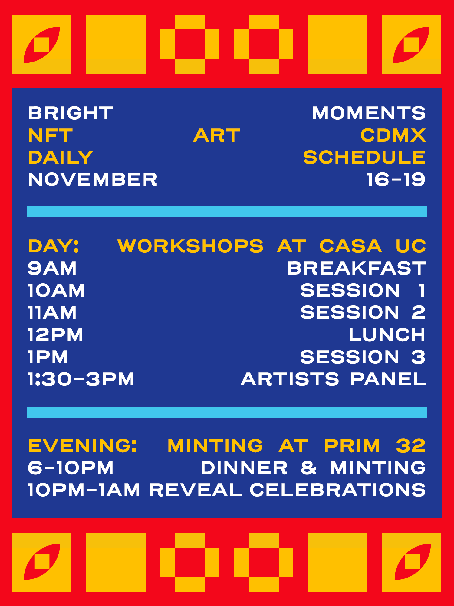 In Mexico we will host NFT ART CDMX: A four day celebration at General Prim 32, featuring nocturnal minting of 3,000+ on-chain generative artworks, a celebration of death and the afterlife, daytime educational programming, & local cuisine banquets for guests and minters. You must have a Golden Token Mexico City or Mint Pass Mexico City to attend NFT ART CDMX.
